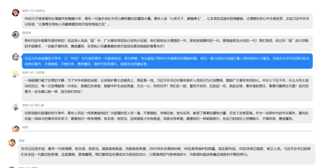 学习会上,支部党员们纷纷发言,畅谈学习回信的内心感想和奋斗决心。物流本科生支部党员蓝李琪表示,时代在进步,我们在成长。我是99年出生的,是90年代的最后一批人,我很庆幸自己生活在这个年代,也很感激国家为我们做出的努力。所以在国家有困难的时候,为国家做出自己力所能及的贡献也是应该的。工程本科生党员廖茂钰表示,正如习总书记所说,青年一代有理想,有本领,有担当,国家就有前途,民族就有希望。作为90后的我们需要铭记责任,踏实学知识本领,学会去服务社会,务必使自己成为“有理想,有本领,有担当”的新时代青年。电商本科生党支部胡江涛表示,作为一名新时代的中共青年,要向在抗疫一线战斗的青年同志学习,要像他们一样有理想,有本领,有担当。