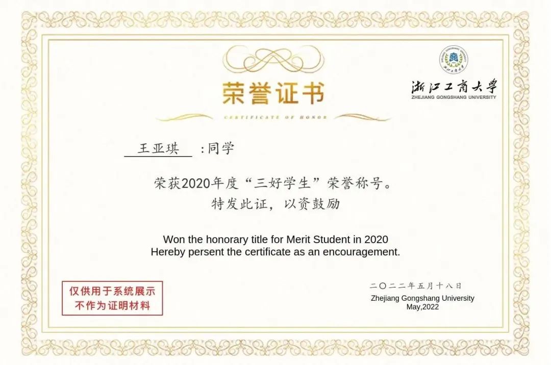 优秀学生三等奖学金(两次)