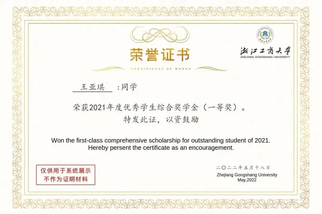 优秀学生一等奖学金