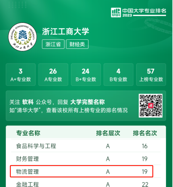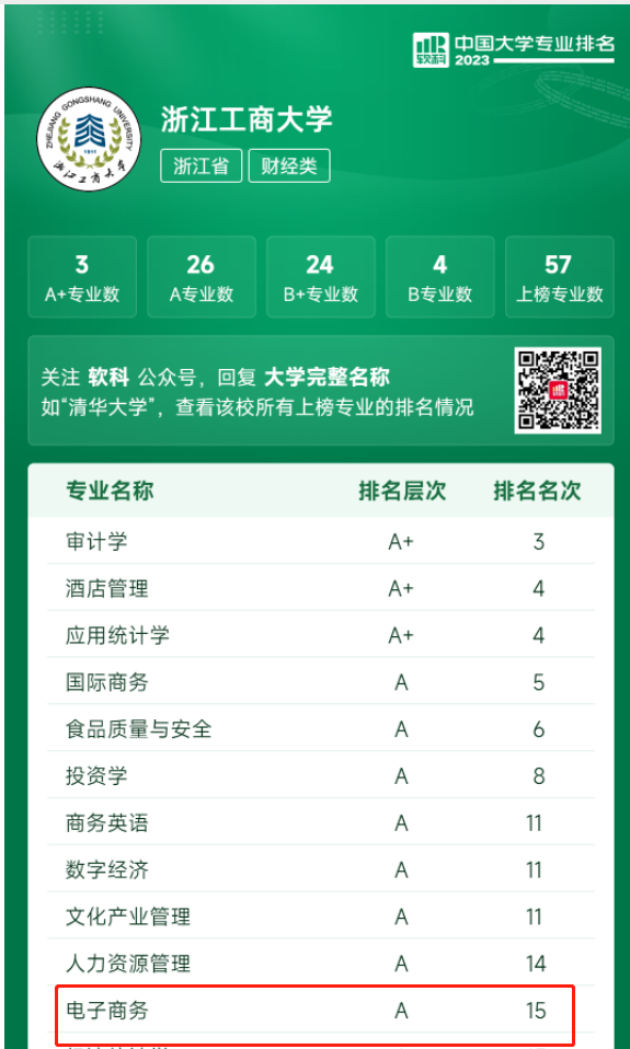 2023年6月15日,高等教育专业评价机构软科正式发布“2023软科中国大学专业排名”,排名包括787个专业,涉及93个专业类、12个专业门类。开云体育 开云体育 三个专业均为上榜专业,其中电子商务专业排名层次为A,排名名次第15,较去年上升4名,进入全国前5%;物流管理专业排名层次为A,排名名次第19,较去年上升12名,进入全国前7%;信息管理与信息系统专业排名档次B+,排名与去年持平。
