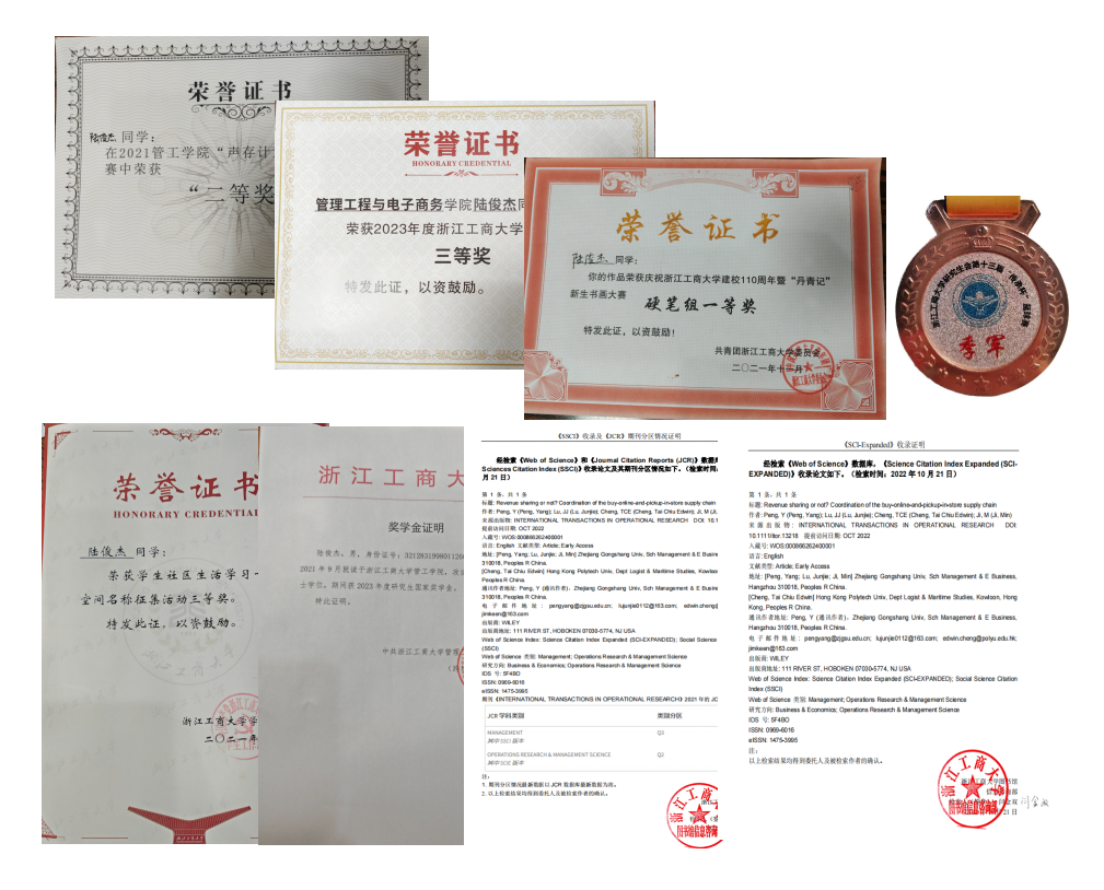 陆俊杰,开云体育 物流工程与管理专业21级研究生。入学以来,在导师的带领下,致力于全渠道零售和医药供应链方向的研究,获得2023年度研究生国家奖学金和学业一等奖学金。在2022年10月,以导师一作,本人二作的身份在期刊INTERNATIONAL TRANSACTIONS IN OPERATIONAL RESEARCH(SCI二区,SSCI三区)上发表论文一篇;也曾参与国家社科基金项目,负责全渠道零售专著撰写。在研究生就读期间,借助开云体育 这个优秀的平台,参与了诸多文体艺竞赛,获得过校研究生数模比赛三等奖,建校110周年书画大赛硬笔字一等奖,研究生篮球比赛季军,开云体育 征名活动三等奖,开云体育 歌唱比赛二等奖等荣誉。在社会实践方面,曾于2022年暑期在江苏华为医药物流有限公司实习调研,也曾利用假期时间参与文明城市创建交通引导志愿服务和关爱留守儿童志愿服务等,在锻炼自身的同时也是回报社会的一种方式。通过怀揣着对知识的不断渴求,借助研究生阶段较为丰富的经历,即将在毕业后入职国企。