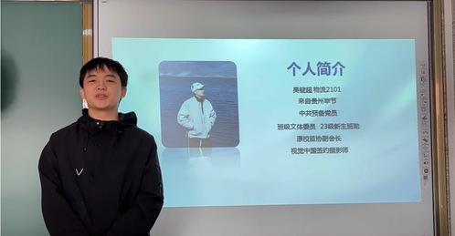 吴同学向大家介绍了自己三个时期的经历。作为班级文体委员、校篮球协会副会长、新生班主任助理,以及中国共产党党员,在学生工作中展现了领导力和奉献精神。社会实践中,以摄影记者、签约摄影师和直播电商运营的身份积累了专业经验。在校宣传工作中,作为“追光工厂”团队的骨干成员,参与创作了获得国家级荣誉的微电影《婺光十色》。吴同学成功做到了用镜头记录世界,用行动践行理论宣传。