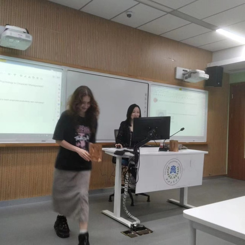 康婷婷女士从“AI and psychology in action”引出了当代公司管理中的特点。然后以“The ever increasing role of AI in medical imaging”引导同学们参与数字技术是如何应用在当代管理中的讨论。分别从“The synergy of AI and psychology in corporate management”,“Ethical concerns of AI in corporate management”和“The evolving role of corporate management”阐述了管理科学未来面临的挑战和发展趋势。同时康婷婷女士也分享了自己在中国、美国大学的学习经历,并分享了她在美国纽约、中国杭州的创业经历和感悟,勉励大家要赶上时代潮流,充分利用数字化技术来管理企业,珍惜自己的行业口碑。