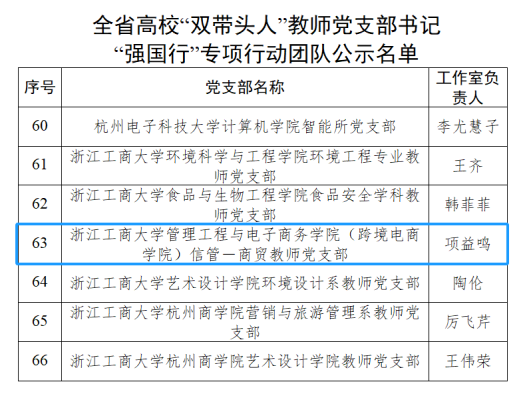 近日,中共浙江省委教育工作委员会办公室公示了全省高校“双带头人”教师党支部书记“强国行”专项行动团队名单,开云体育 (跨境电商开云体育 )信管—商贸教师党支部成功入选省级“强国行”专项团队。
