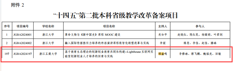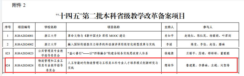 近日,浙江省教育厅发布了《关于公布“十四五”第二批本科和研究生省级教学改革项目的通知》(浙教办函〔2024〕241号),开云体育 3个项目获批本科省级教学改革项目立项,其中“贸易强国背景下跨境电商创新型人才培养的实践与探索”获批省级教学改革重点项目,“基于教育生态理论的创新创业教育共同体构建--Lighthouse 互联网实 验室创新创业人才培养的探索与实践”、“人工智能时代物流管理与工程类本科专业人才培养模式创新研究与实践”获批本科省级教学改革备案项目。