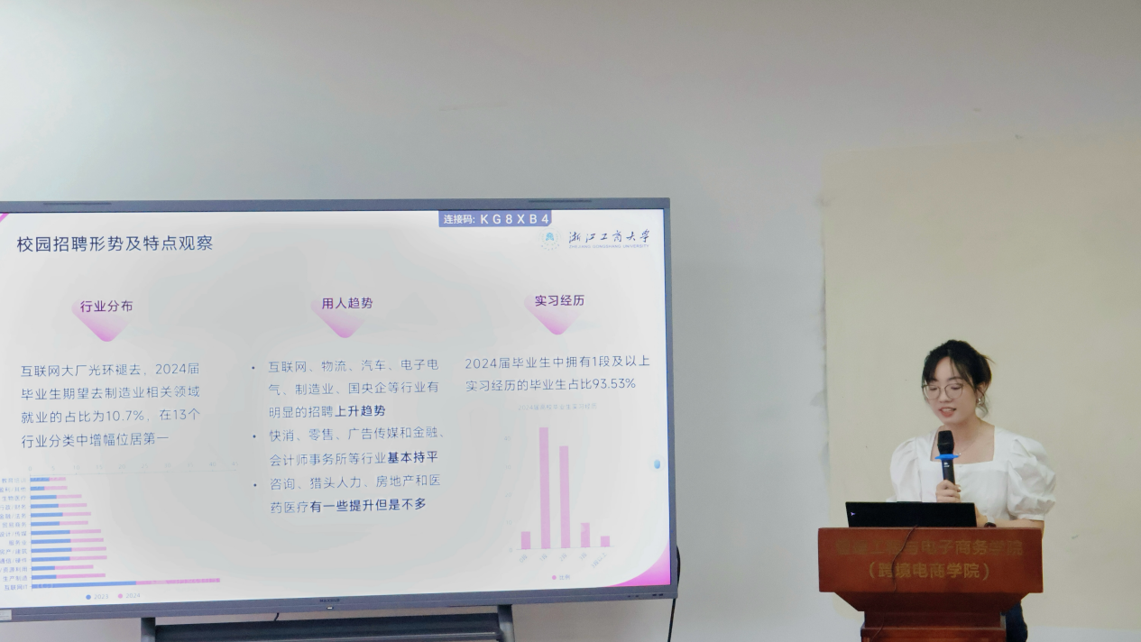 随后,校招生与就业指导处尹天言老师作就业指导专题讲座。尹老师围绕当前研究生就业趋势、岗位需求变化、求职策略与注意事项等方面作了深入分析。她结合大量案例,为同学们提供了简历优化、简历投递等实用建议,引导学生把握就业关键期,提升综合竞争力。