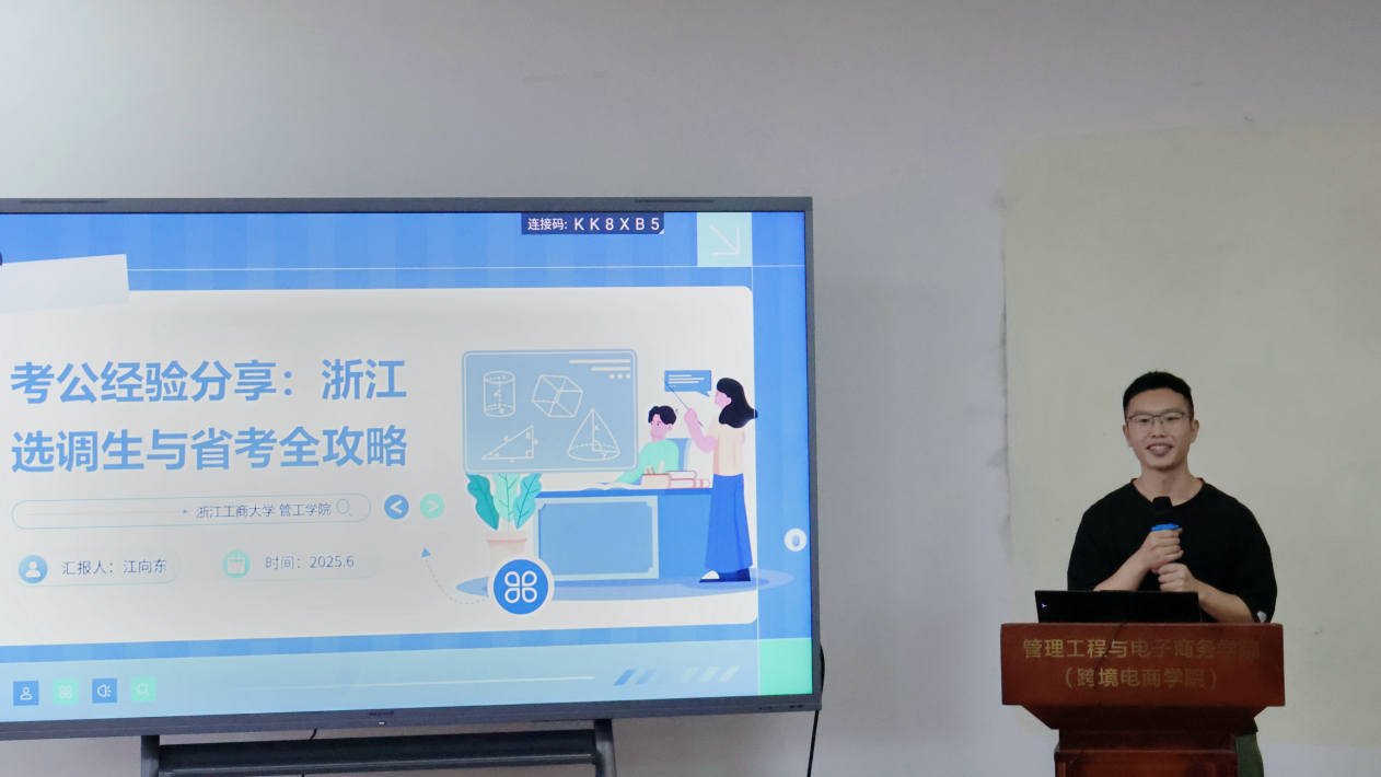 在经验分享环节,2025届浙江省选调生江向东学长结合自身求职经历,分享了从岗位选择到笔面备考的全过程。他用“目标明确、行动坚定、坚持到底”三个关键词鼓励学弟学妹勇敢迎战、全力以赴。他的真诚分享赢得了同学们阵阵掌声,也为在场同学带来了信心与启发。