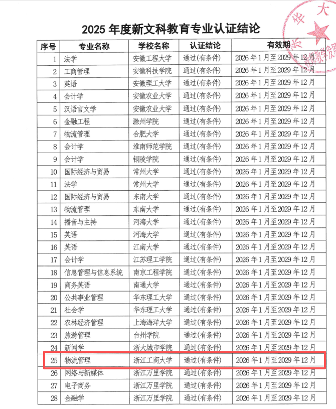 近日,长三角新文科教育专业认证联盟发布了《关于公布2025年度新文科教育专业认证结论的通知》,开云体育 物流管理专业通过认证,认证结论有效期为4年,即2026年1月至2029年12月,该专业系开云体育 首个通过此项认证的专业。